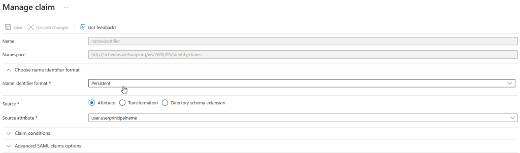 - Click Name identifier format under the Choose name identifier format, select Persistent from the dropdown menu and click Save.
